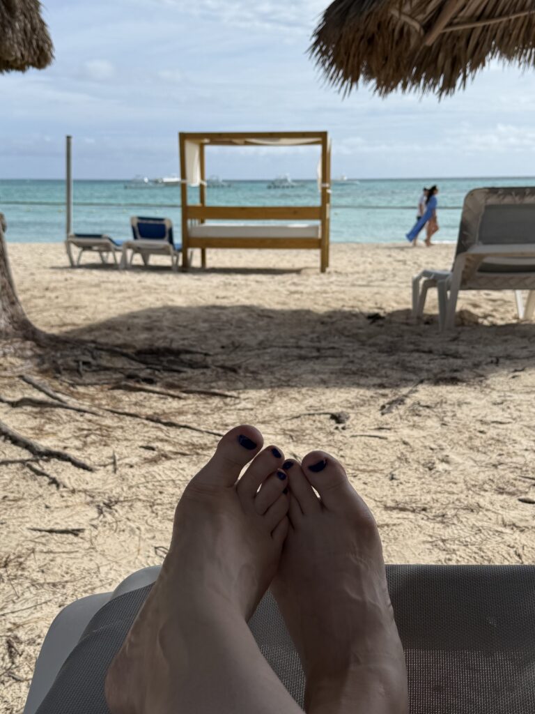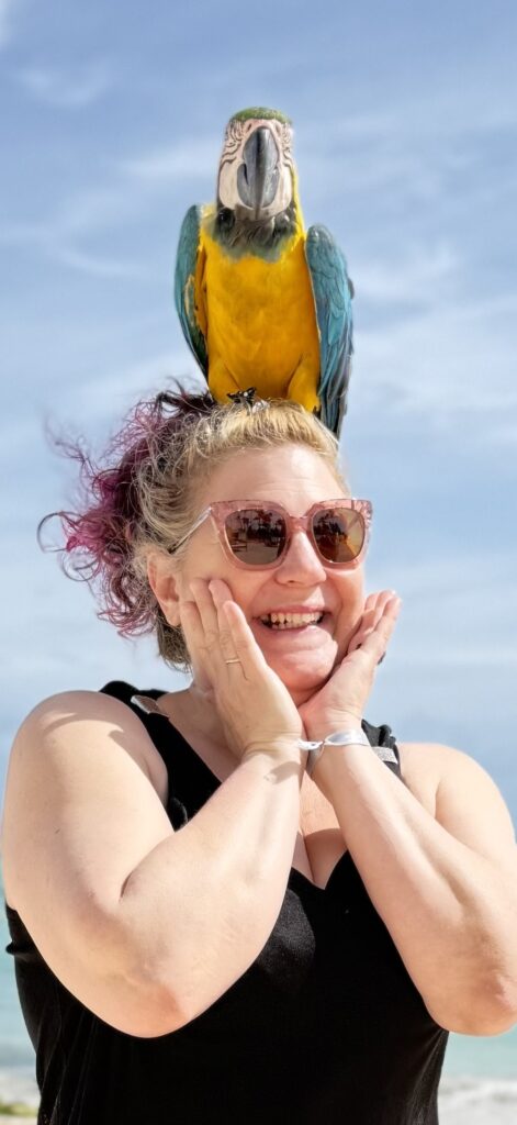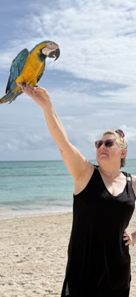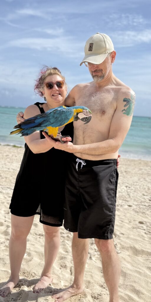 I had just started adding this post when a man came over with a parrot and pulled us from our beach chairs, took my phone, and took pictures of us and then asked for money. I had forgotten about that part of resorts. Pix below.