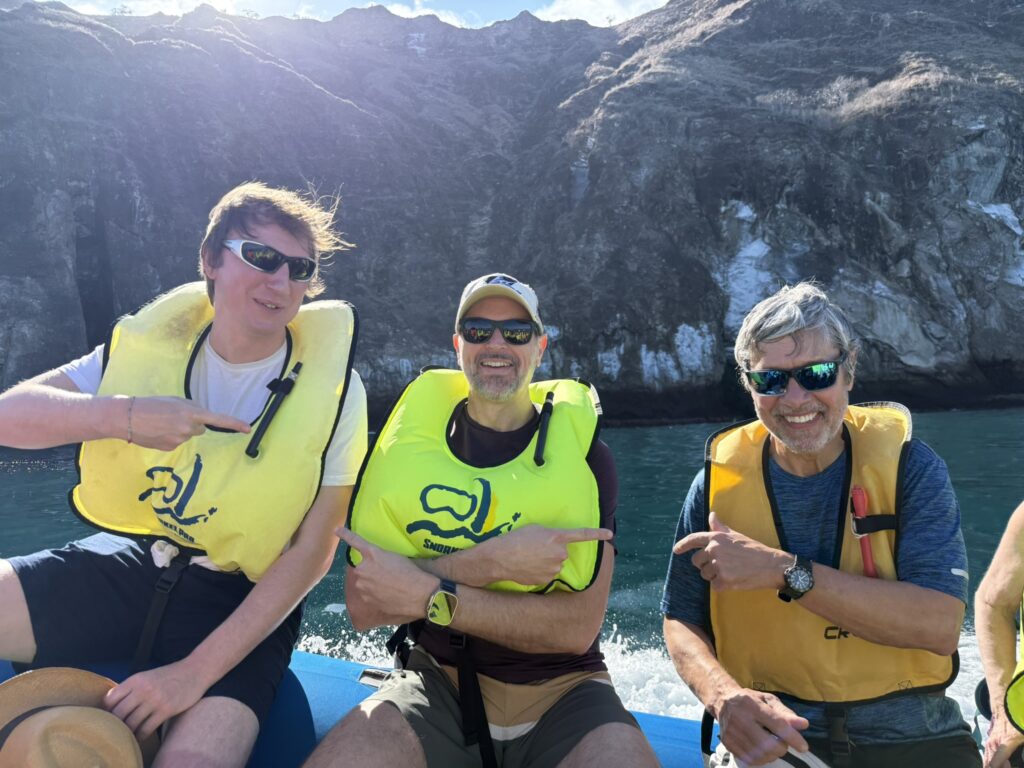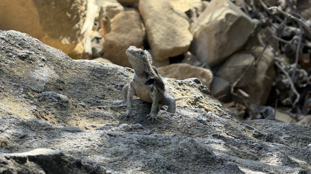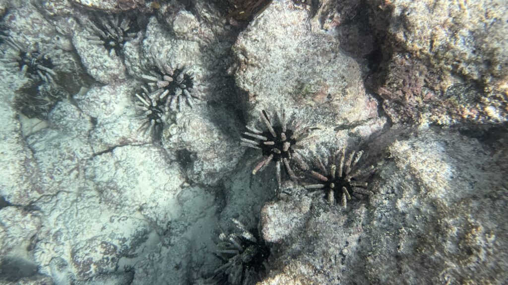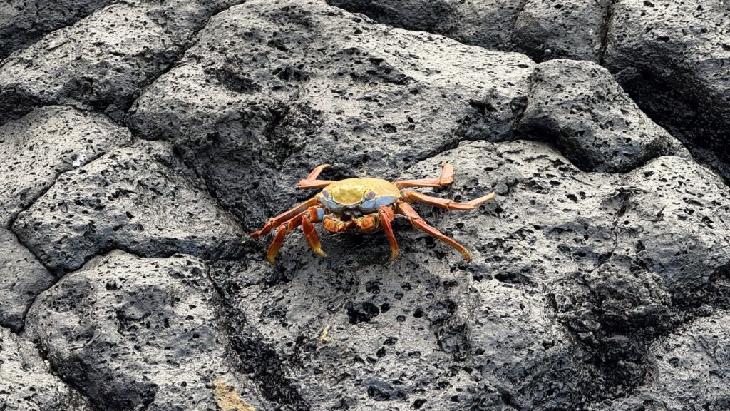 So after lunch we headed to Punta Pitt, which we were told was a relatively difficult, rocky hike followed by snorkeling. So I grabbed my trekking poles, hiking boots and everything I would need for sun cover and hiking and snorkeling. I was wondering how we were all going to carry all of this stuff for the hike, but it turns out that only very small numbers of people are allowed at any beach at any given time. What that means is that everywhere we went it was almost ALWAYS just us there. So we just left all of our stuff on the beach, valuables and all, and started the hike. We saw crabs, Red Footed Boobies, Frigates, lizards, and goats. Turns out the goats are not supposed to be there. They arrived as livestock on boats and were left behind and since they have no predators. they multiplied like crazy. The guide was going to “call it in”. I suspect these goats are no more…