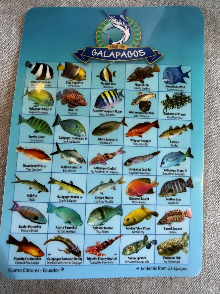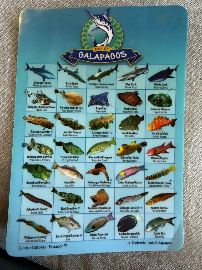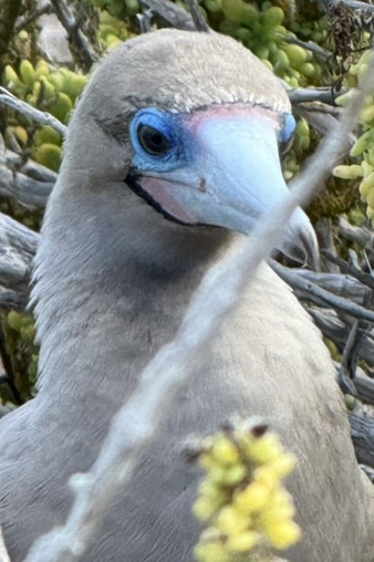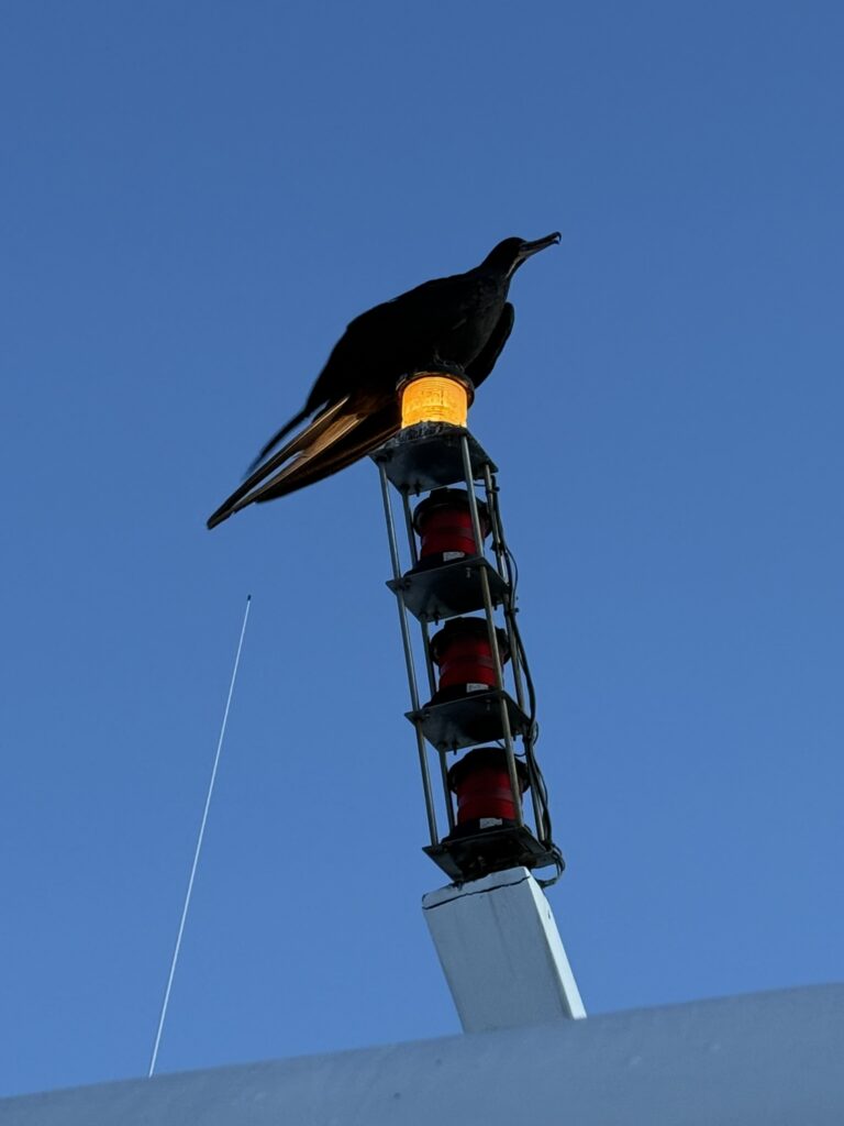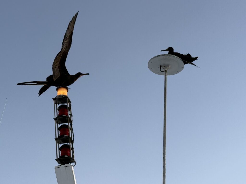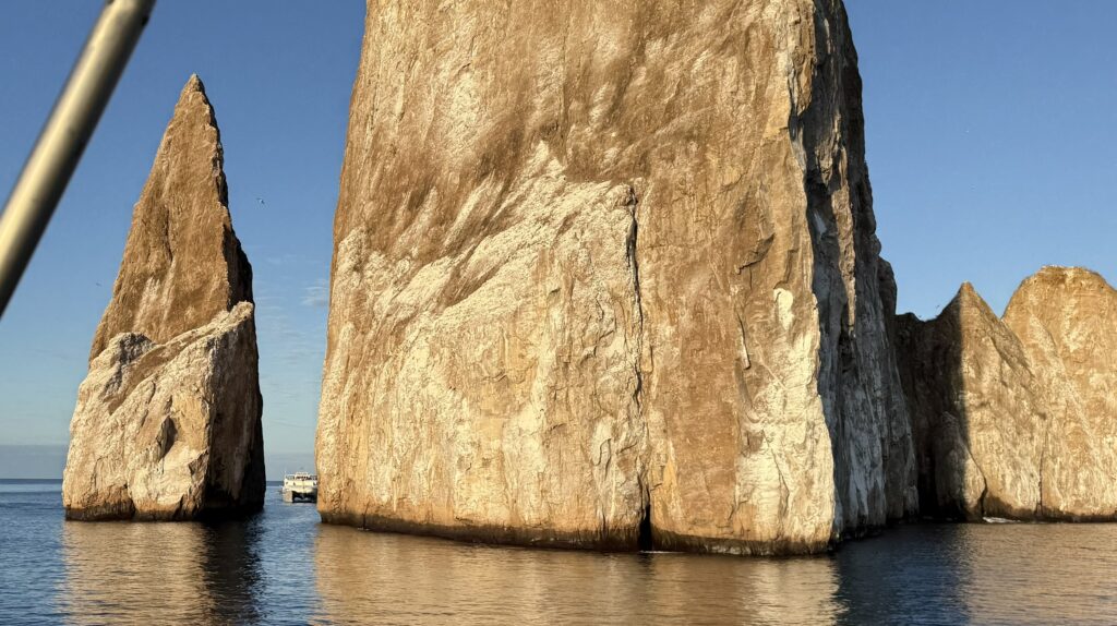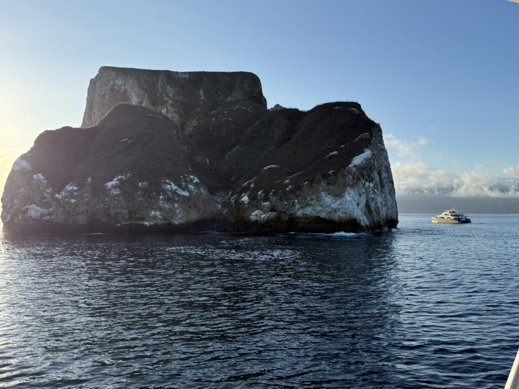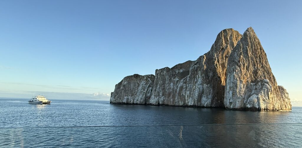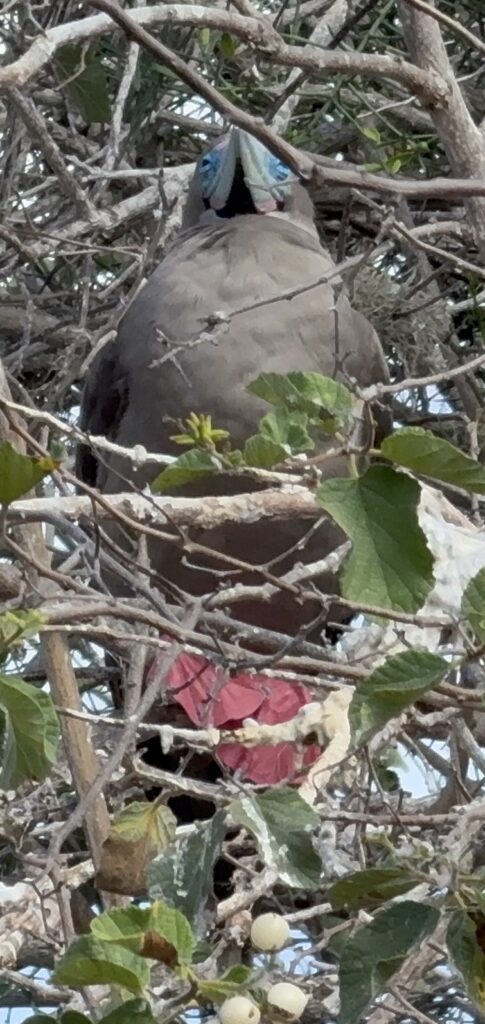 Our day started with a circumnavigation around San Cristobal Island. I was up at 6 and went straight up to the observation deck to see what I could see, and I saw Frigates! All the Frigates flying around my head! They are majestic and they look like Batman. They have at least a 4-foot wingspan. They have hooked beaks which means they can’t dive for fish, so they steal fish, mostly from Boobies. They will attack the Boobies without hurting them, but it gets them to drop the fish. This first morning on the Coral 1, I was up on the observation deck while it was still dark and as the sun rose, I realized all these giant birds were following and landing on the mast of the ship. The guide explained that they think the ships are fishing boats.