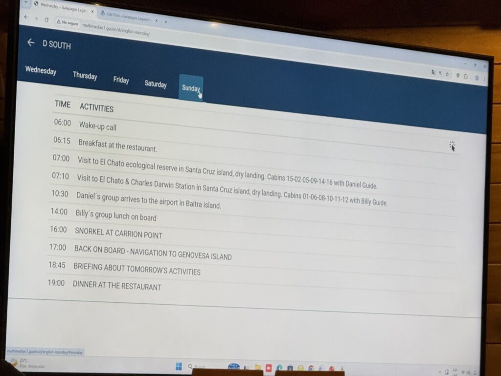 So this was our schedule for the day…. An extra early wakeup call – 6am, so that we could be separated into our groups and taken to different locations depending on if we were staying or leaving. We also had an injury on the boat. One of the guests slipped on the stairs and had to get to a hospital, so there was a lot of organization that had to take place. And hats off to the staff on the boat. THEY ARE ALL AMAZING.