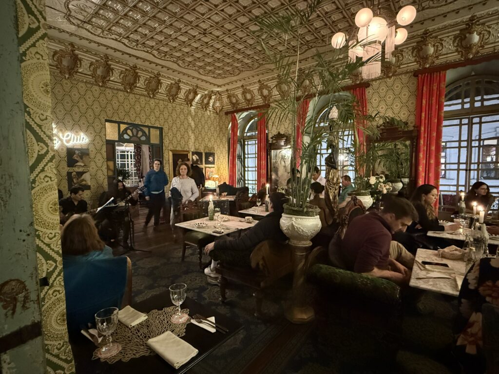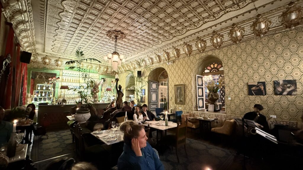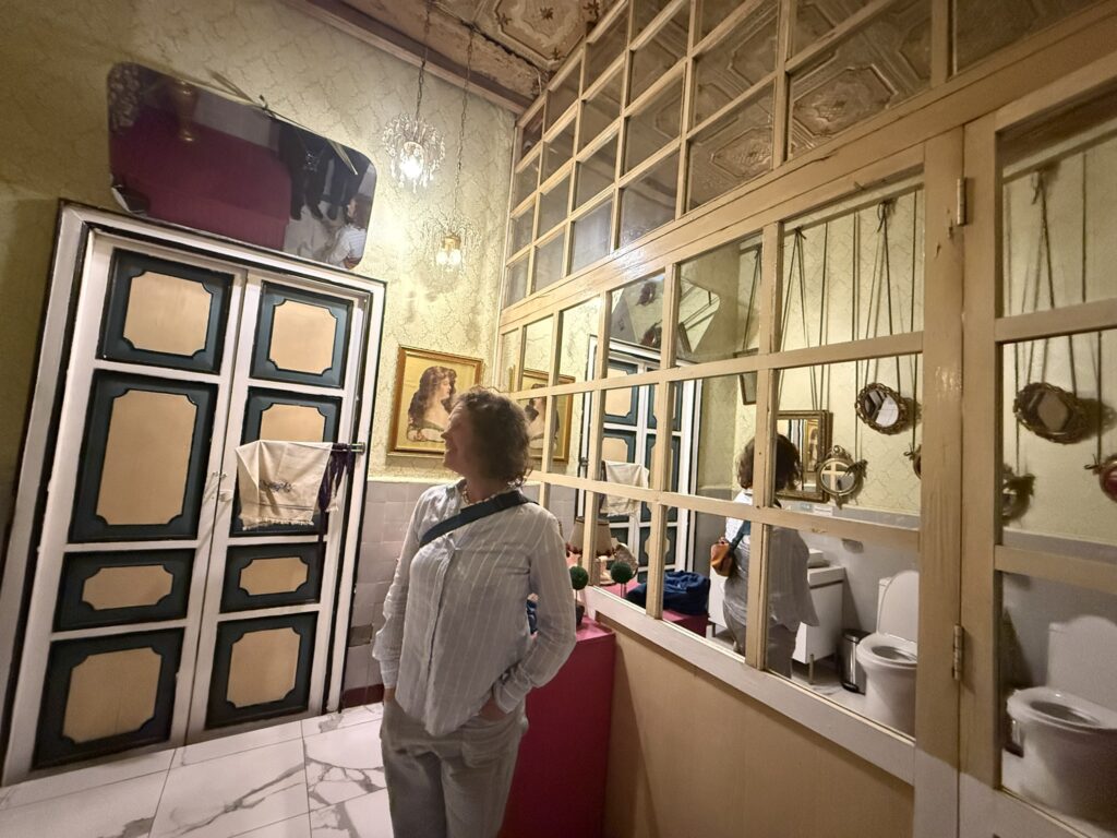 Sara and Kathryn were friends from the cruise who also happened to be in Cuenca. The rooftop restaurant had a great view and we could hear the festivities from the square below. After dinner we watched a bit of the music and dancing in the park and then went to a jazz place for drinks. It was the most interesting looking place. It was like an old giant house that was inside an external facade. Upstairs in the “house” there were several rooms that looked like the old bedrooms, library, dining room etc.. of the house. The women’s bathroom was hard to find, but when I did it was wild.