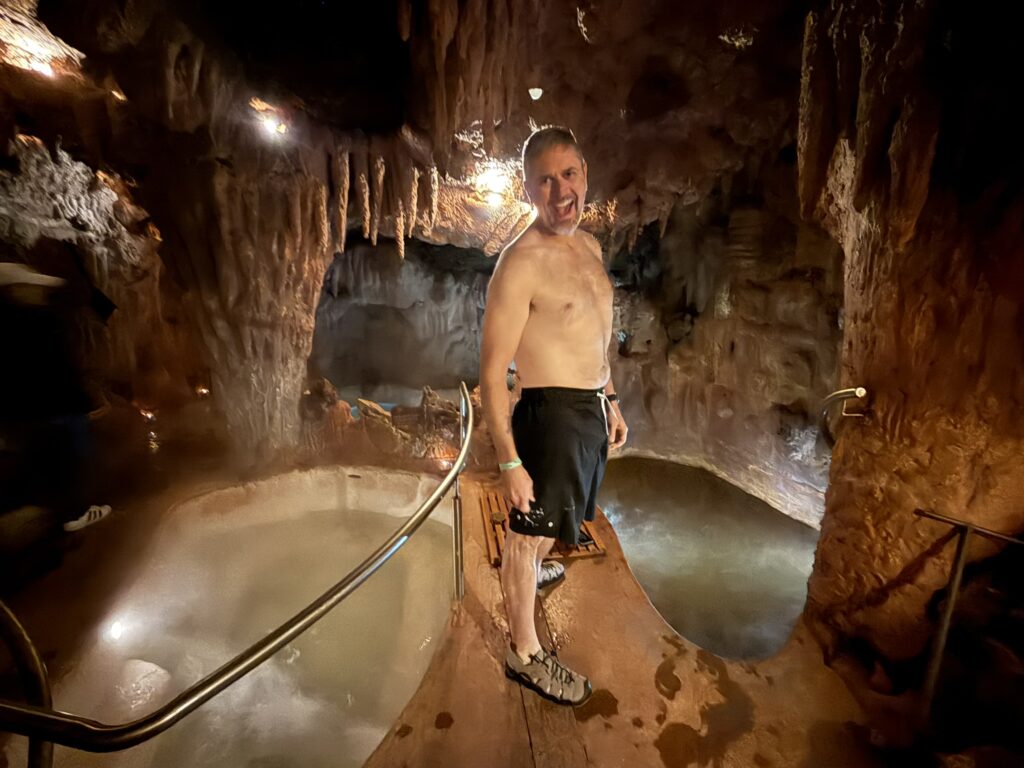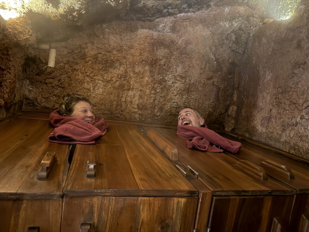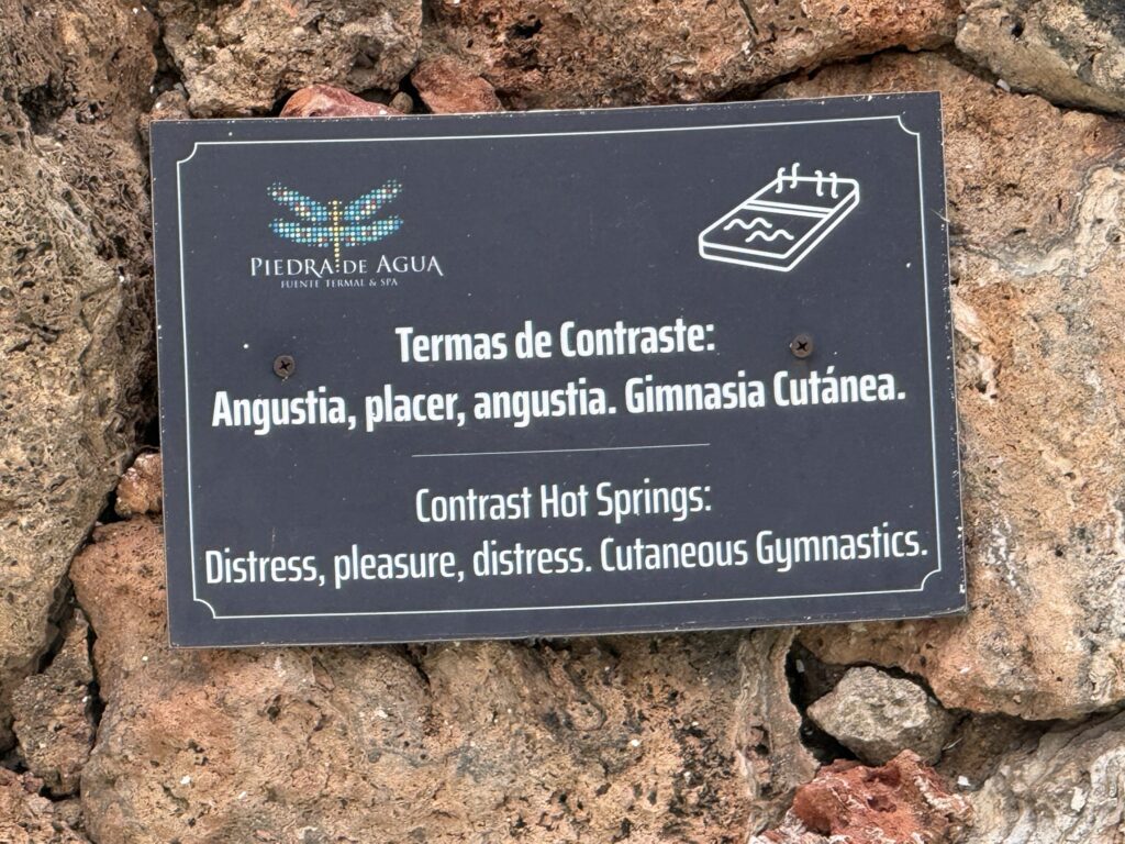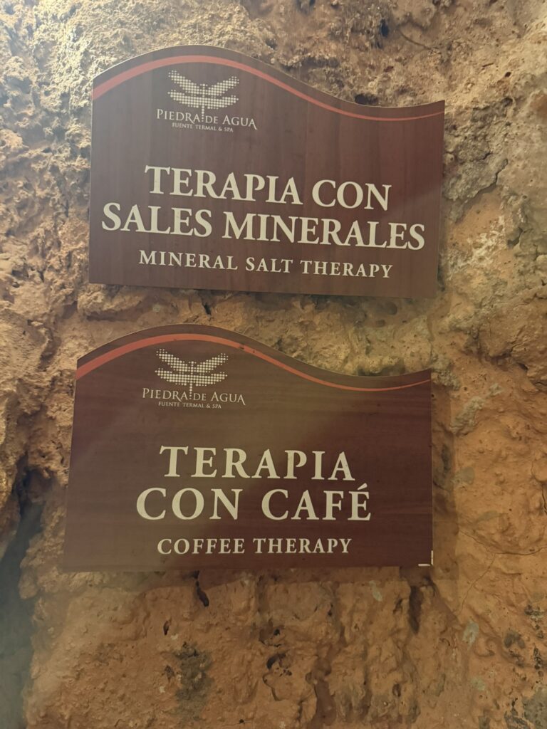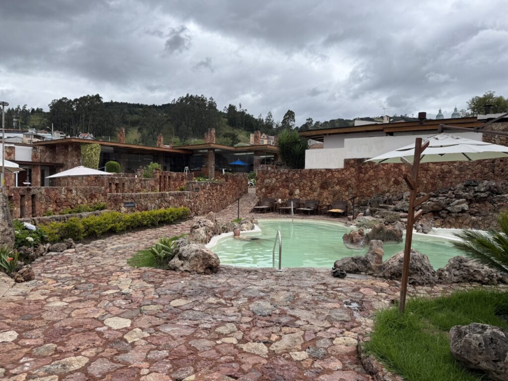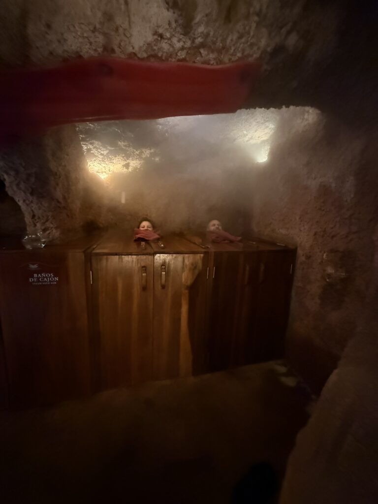 This was our last full day in Cuenca. We slept in, really for the first time on the trip. Woke up naturally at 7:30 or so. I had pre-booked a spa day at Piedra de Agua, a famous local spa. I had seen videos about it 6 months earlier and booked it on the off chance that we might really want a day of relaxation and pampering, and I’m so glad I did. We got there at 10am and didn’t leave until 3:30pm. There was a typical waters area of pools at different temperatures outside, but inside, underground and built into the volcanic rock were the various mud baths, steam rooms, and pools. It looked like the underground set of the old Star Trek episode, What Are Little Girls Made Of.
