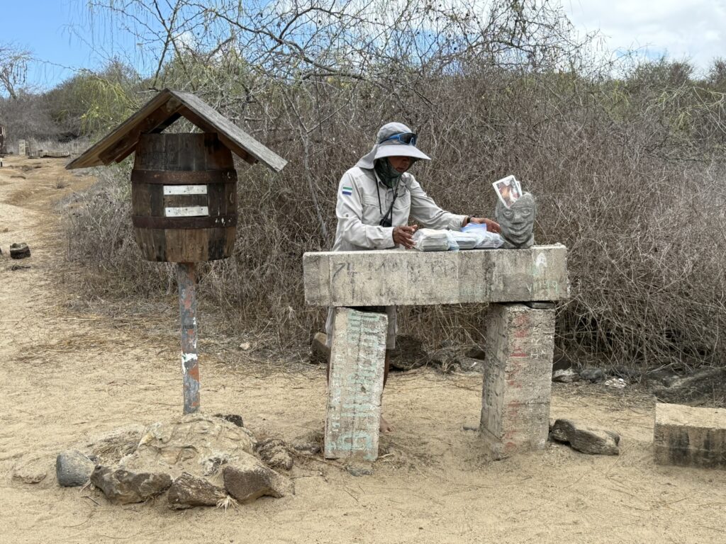 In 1793, a post office was installed on the north side of Floreana Island. It’s still there. So how it works is you drop off postcards there, and when other people from your country come by, they pick them up and bring them home and mail them. We have some for Canadians to mail.